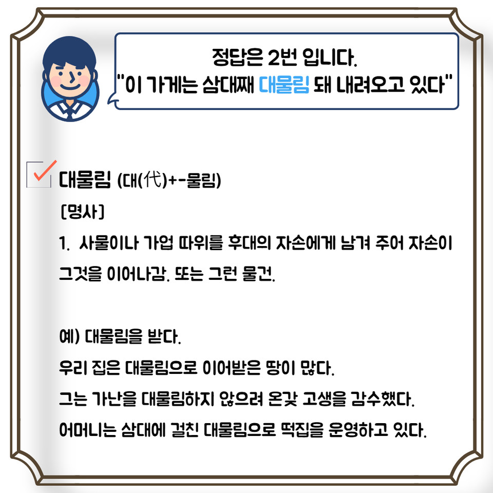 정답은 2번 “이 가게는 삼대째 대물림돼 내려오고 있다”입니다.