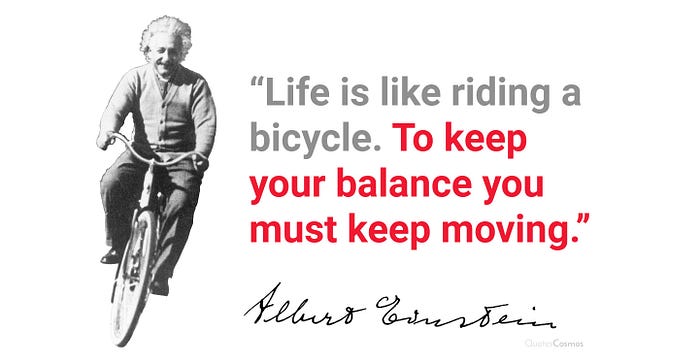 이것은 아인슈타인이 1930년 2월 5일에 아들 에두아르트에게 쓴 편지에서 인용한 것입니다. 그는 아들에게 "인생은 자전거를 타는 것과 같아. 균형을 유지하려면 계속 움직여야 해."라고 격려합니다. Walter Isaacson의 책 Einstein: His Life and Universe (2007) 367쪽에서 발췌