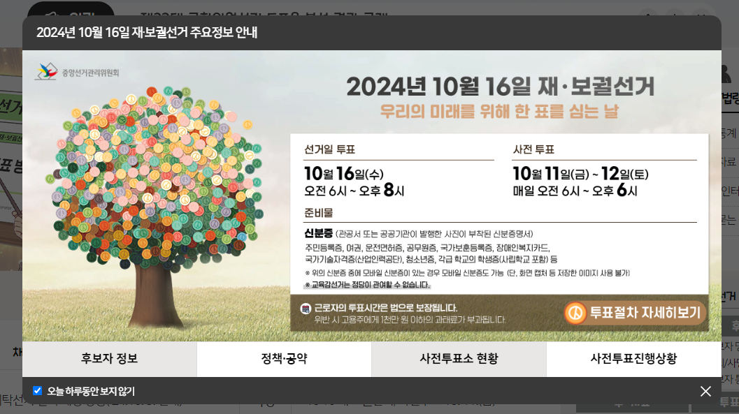 2024년 10월 16일 재·보궐선거 주요정보 안내 알림 민원 정당/후보자 선거/법령 민주시민 알림·소식 더보기 공고 더보기 채용 더보기 정책·제도 더보기 한국선거방송 더보기 보도자료·알림 더보