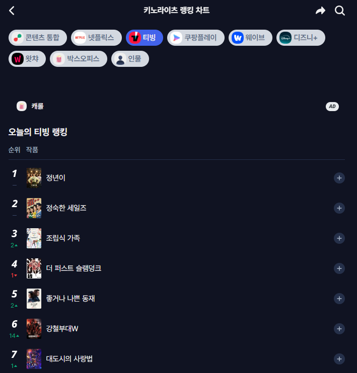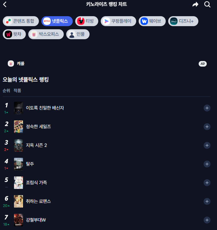 OTT 2024-11-07 인기순위, 넷플릭스,티빙,디즈니... 디즈니 점점 멀어지는듯.