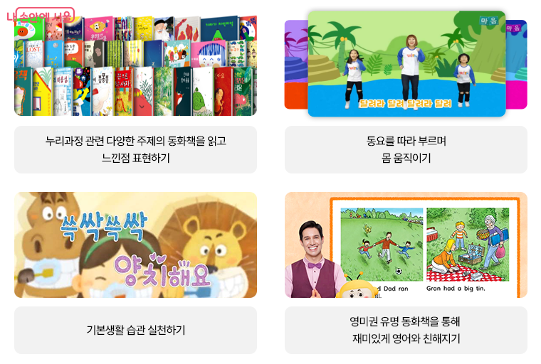 콘텐츠 주요 내용으로는 ▲다양한 주제의 동화책을 읽고 한글 익히기 ▲동요를 따라 부르며 몸 움직이기 ▲기본생활 습관 실천하기 ▲영미권 유명 동화책을 통해 재미있게 영어와 친해지기 등이 있다.