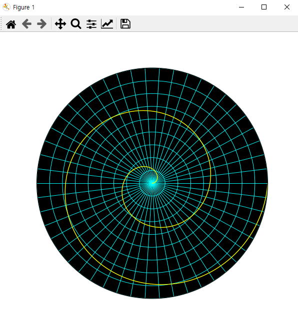 ax.plot(spiral_theta, spiral_r, color='yellow', linewidth=1)