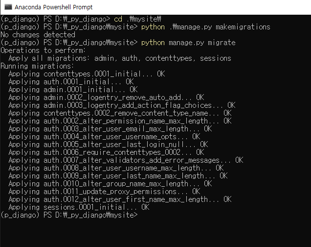 (.conda) (c:\dev\django\.conda) C:\dev\django\mysite>python manage.py migrate
