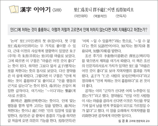 [한자 이야기]里仁爲美니 擇不處仁이면 焉得知리오