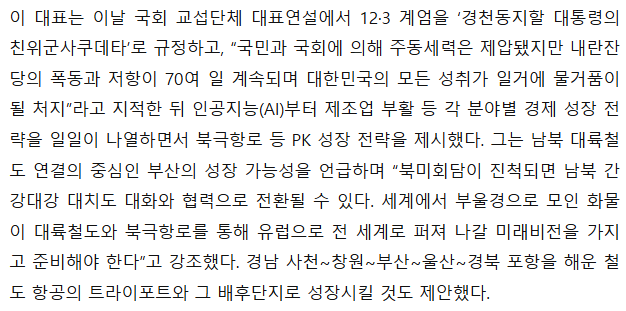 이 대표는 이날 국회 교섭단체 대표연설에서 12·3 계엄을 ‘경천동지할 대통령의 친위군사쿠데타’로 규정하고, “국민과 국회에 의해 주동세력은 제압됐지만 내란잔당의 폭동과 저항이 70여 일 계속되며 대한민국의 모든 성취가 일거에 물거품이 될 처지”라고 지적한 뒤 인공지능(AI)부터 제조업 부활 등 각 분야별 경제 성장 전략을 일일이 나열하면서 북극항로 등 PK 성장 전략을 제시했다. 그는 남북 대륙철도 연결의 중심인 부산의 성장 가능성을 언급하며 “북미회담이 진척되면 남북 간 강대강 대치도 대화와 협력으로 전환될 수 있다. 세계에서 부울경으로 모인 화물이 대륙철도와 북극항로를 통해 유럽으로 전 세계로 퍼져 나갈 미래비전을 가지고 준비해야 한다”고 강조했다. 경남 사천~창원~부산~울산~경북 포항을 해운 철도 항공의 트라이포트와 그 배후단지로 성장시킬 것도 제안했다.