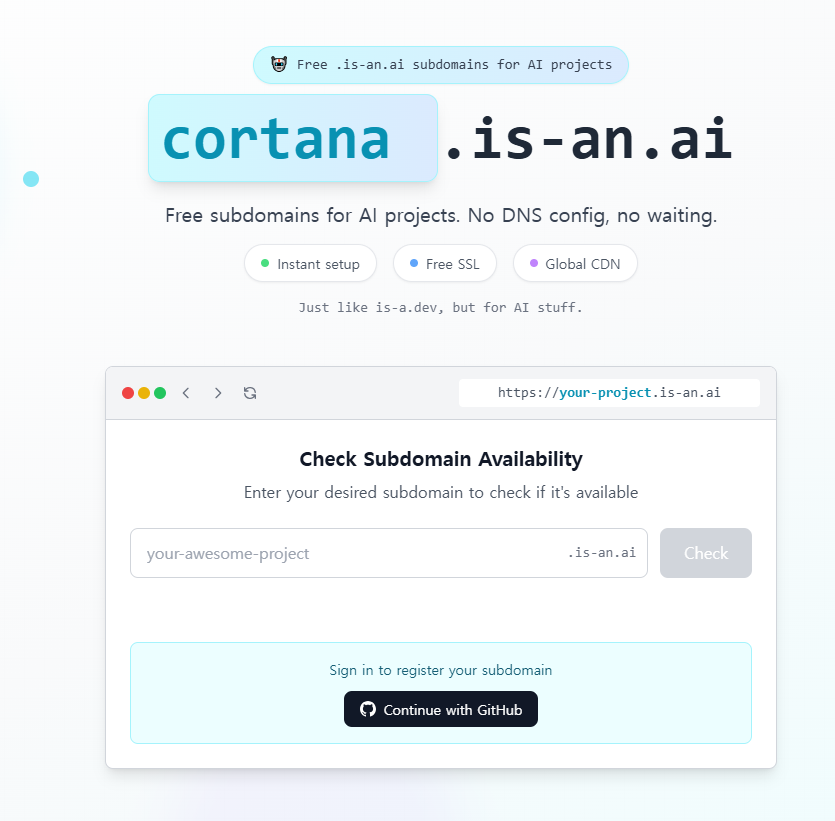 - is-a.dev의 AI 프로젝트 버전으로, cool-project.is-an.ai 같은 서브도메인을 무료로 제공합니다.