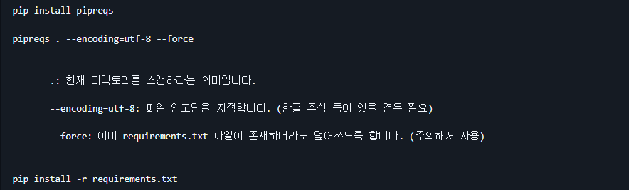 --force: 이미 requirements.txt 파일이 존재하더라도 덮어쓰도록 합니다. (주의해서 사용)