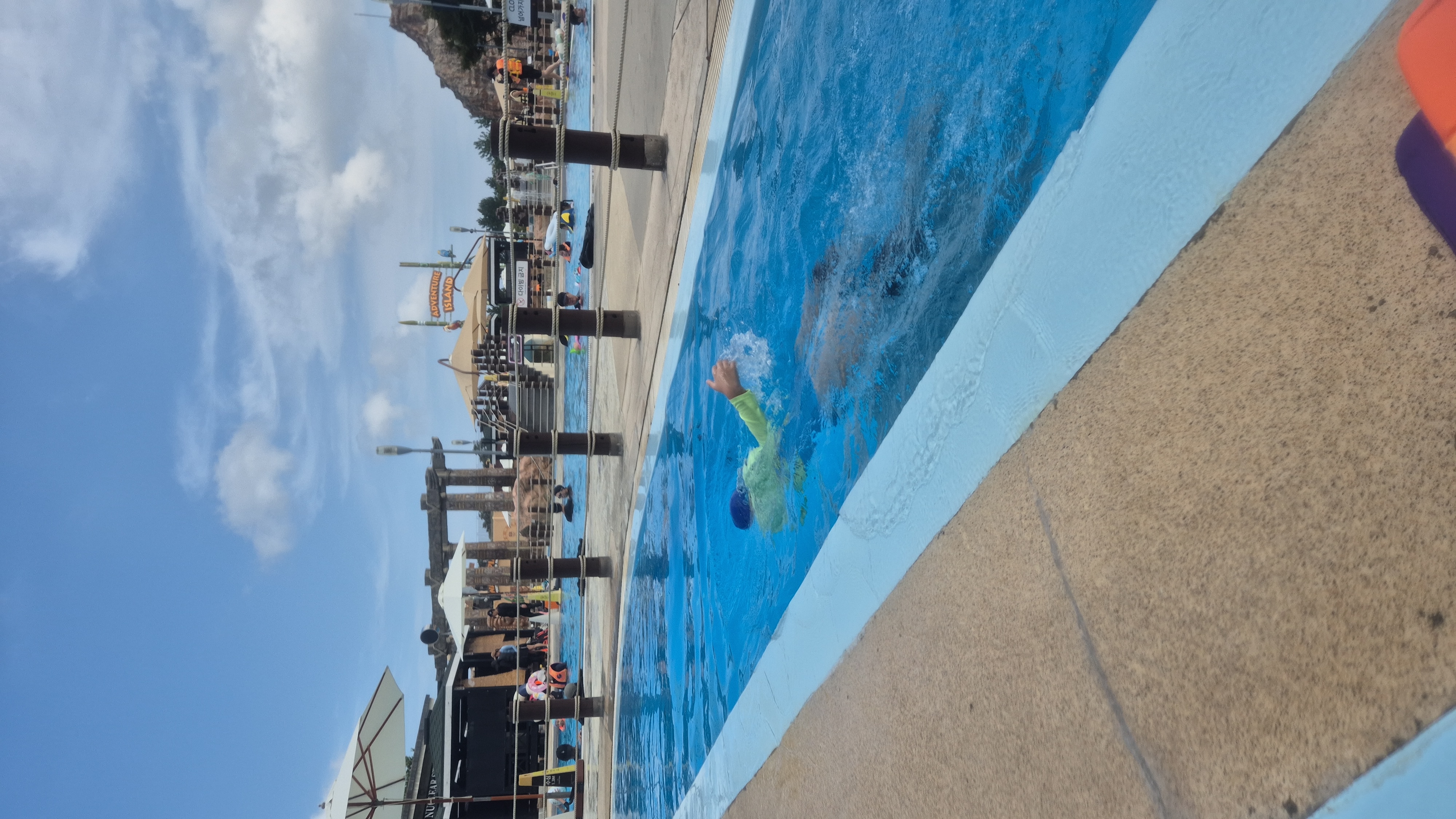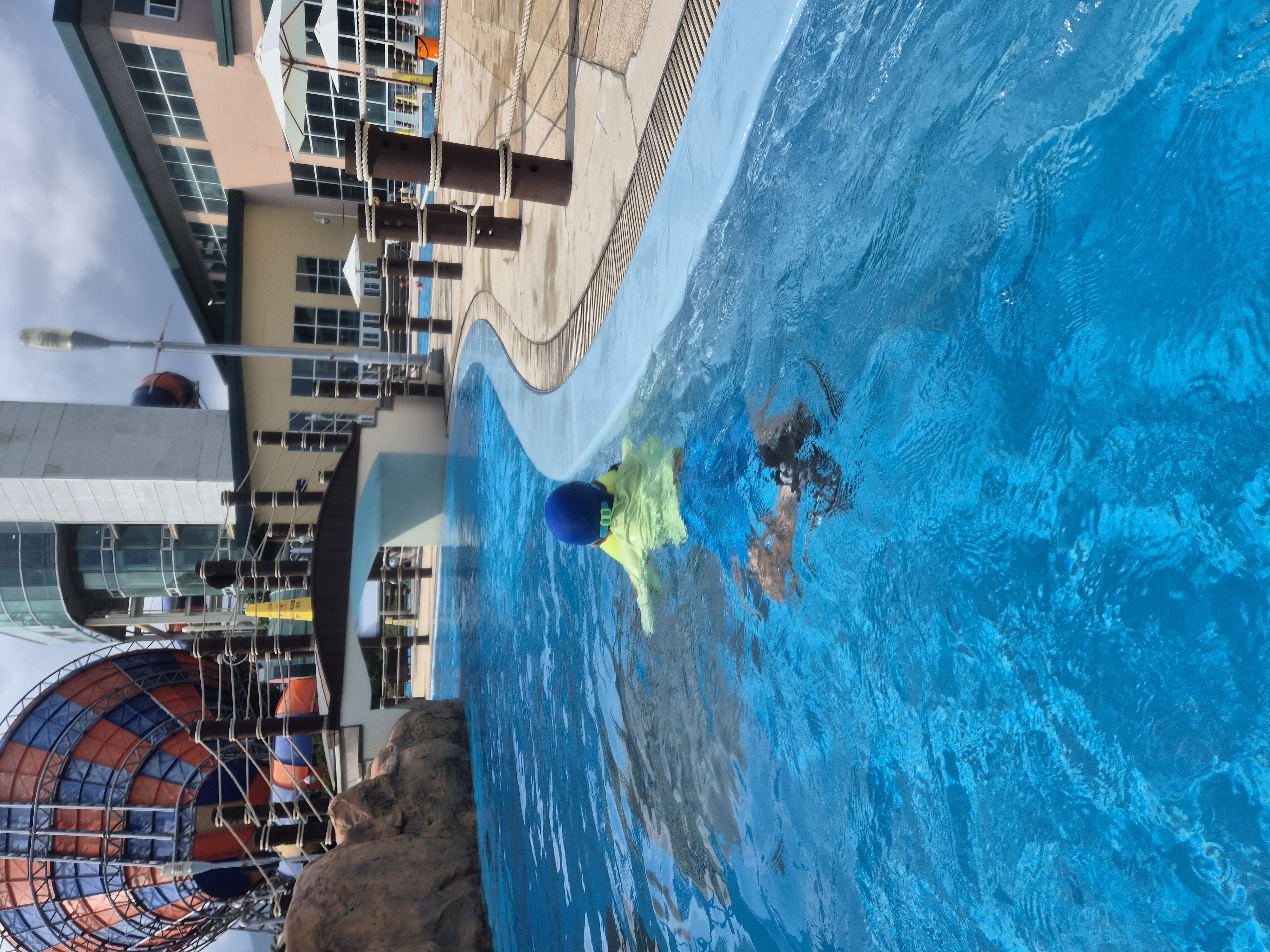 쏘라노에서 유수풀 쓩쓩 놀다가, 파도 한번, 올라가서 타는 슬라이드 한번 타고.