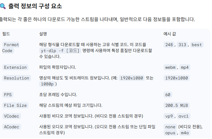 YouTube 또는 기타 지원되는 웹사이트의 영상 URL에 대해 **사용 가능한 모든 다운로드 형식(Format)**의 목록을 세부 정보와 함께 출력하는 데 사용