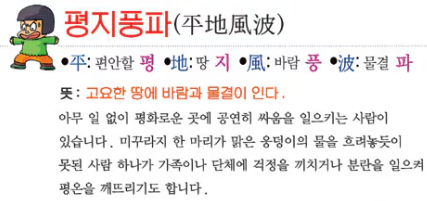 '평지풍파'는 사자성어(四字成語)로, 그 의미는 다음과 같습니다.