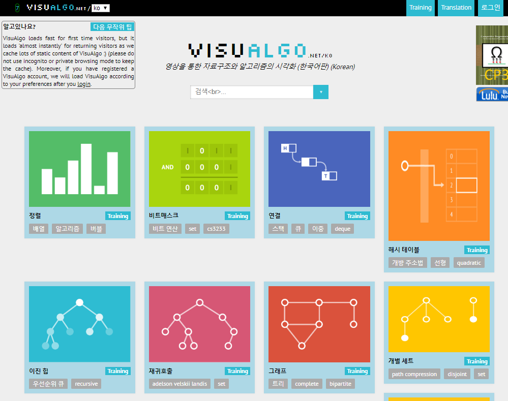 VisuAlgo.net/ko - 영상을 통한 자료구조와 알고리즘의 시각화 (한국어판) (Korean)