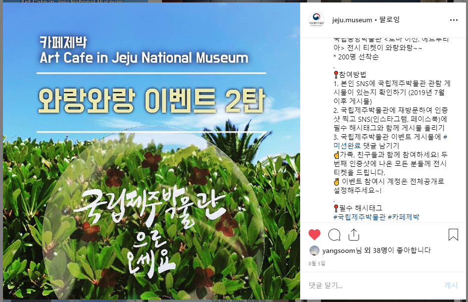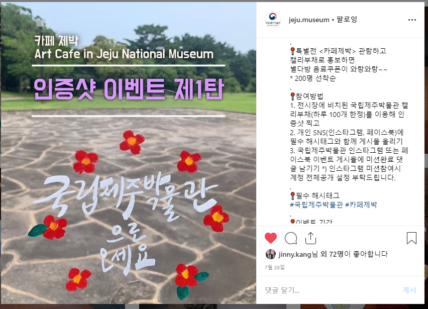 좋아요 73개, 댓글 84개 - Instagram의 국립제주박물관(@jeju.museum)님: "[인증샷 이벤트 와랑와랑 1탄] . 📍특별전 <카페제박> 관람하고 캘리부채로 홍보하면 별다방 음료쿠폰이 와랑와랑~~ * 200명 선착순 . 📍참여방법 1. 전시장에 비치된…"