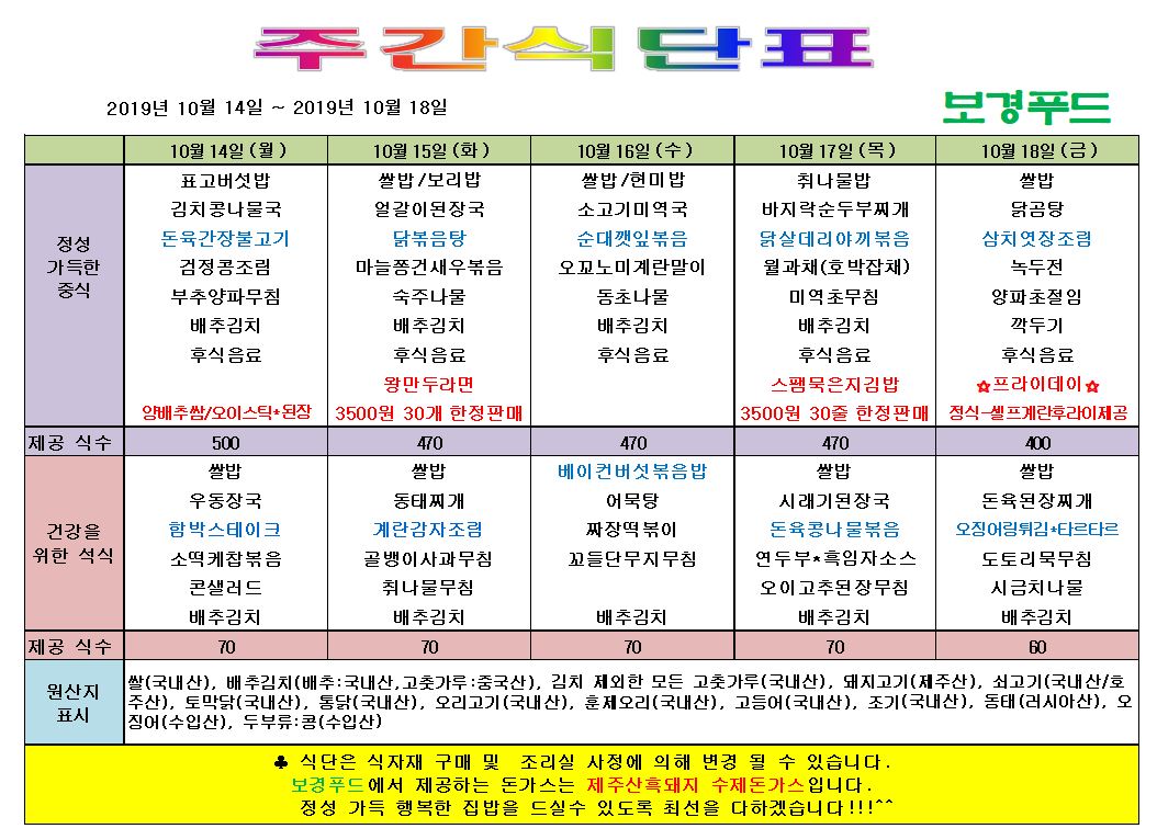 #제주첨단과학기술단지 #구내식당 #메뉴 #2019년 #10월 #3주차 #주간메뉴