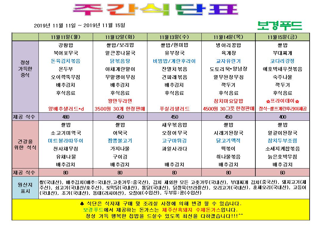 #제주첨단과학기술단지 #구내식당 #메뉴 #2019년 #11월 #2주차 #주간메뉴