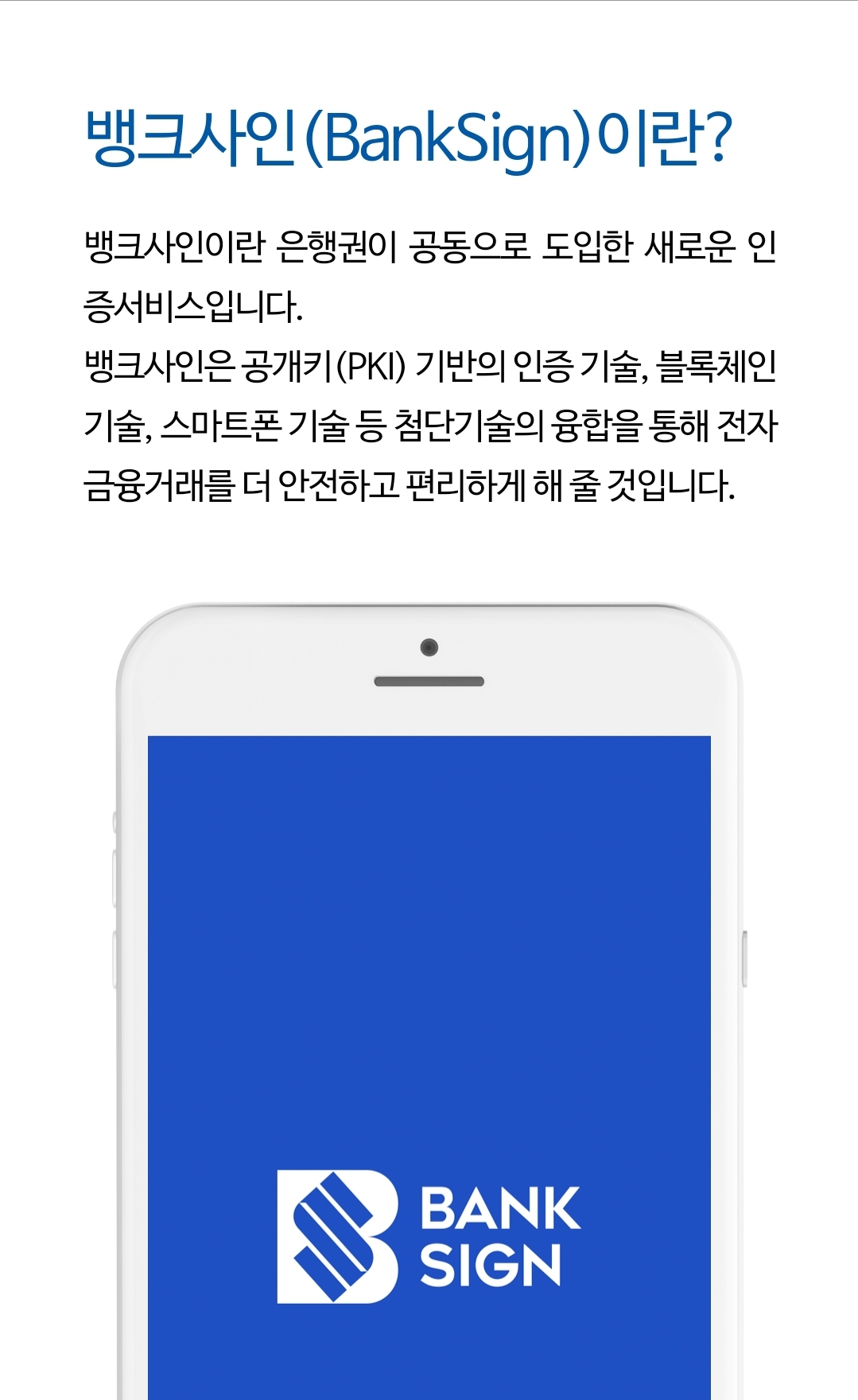 뱅크사인은 공개키(PKI) 기반의 인증 기술, 블록체인 기술, 스마트폰 기술 등 첨단기술의 융합을 통해 전자금융거래를 더 안전하고 편리하게 해 줄 것입니다.