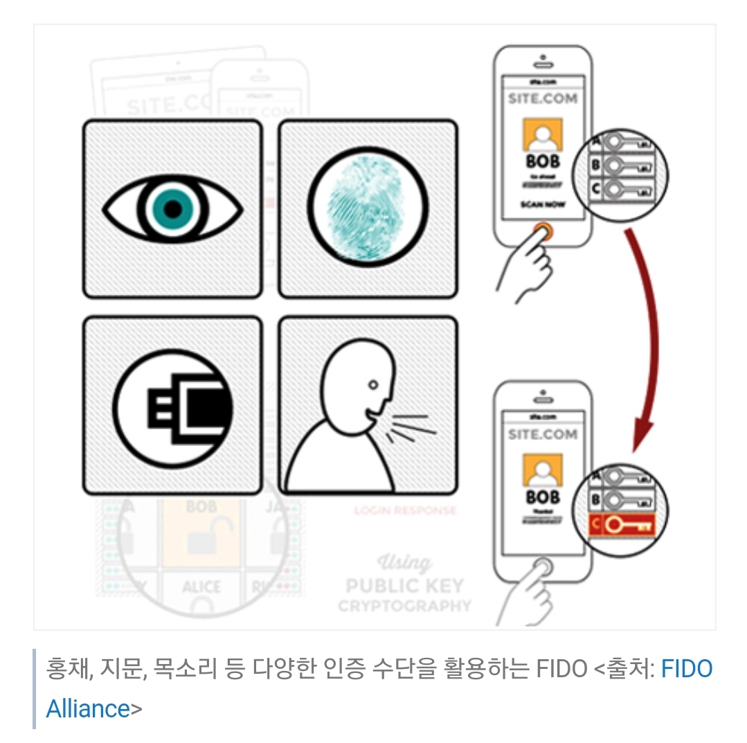 "신속한 온라인 인증"을 뜻하는 'Fast IDentity Online‘의 약자로, 온라인 환경에서 ID,비밀번호 없이 생체인식 기술을 활용하여 보다 편리하고 안전하게 개인 인증을 수행하는 기술이다. 주로 지문, 홍채 등 신체적 특성의 생체정보(Biometrics)가 이용되지만, 동작 등의 행동적 특성의 생체정보 인증 등도 이용되고 있다. FIDO Specification은 비밀번호 없이 인증을 하기 위한 Universal Authentication Framework (UAF) 프로토콜과 비밀번호를 보완해서 인증을 하기 위한 Universal 2nd Factor (U2F) 프로토콜로 구성된다.