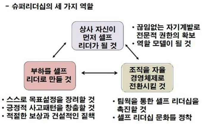 다른 사람이 스스로 자기 자신을 이끌어갈 수 있게 도와주는 리더십을 말한다. 슈퍼리더십은 셀프리더십(self-leadership)에서 출발한 개념으로 이 두 개념은 불가분의 관계에 있다. 셀프리더십이 스스로 자신을 이끌어 가는 과정이라면 슈퍼리더십은 리더 육성에 초점을 두고 부하직원들이 셀프리더십을 발휘할 수 있도록 영향력을 행사하는 과정이다. 즉, 부하직원들이 셀프 리더가 될 수 있도록 그들이 보유한 잠재역량을 자극하고 개발한다.