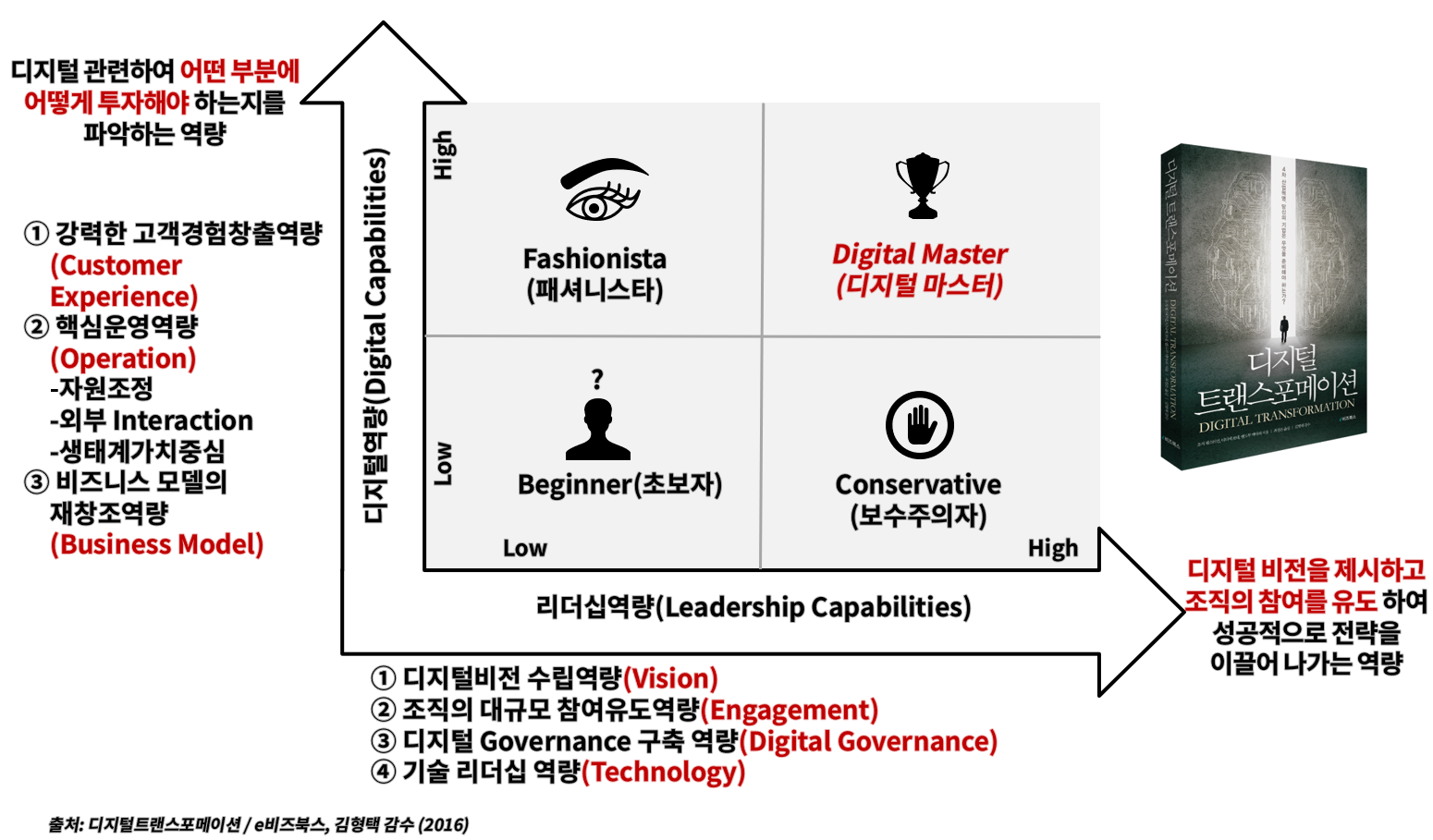 기업의 디지털트랜스포메이션 전략 가속화를 위해서는 기업경영진이 디지털 변화를 이해하고 강력한 디지털비전 및 조직의 참여를 유도하여 성공적으로 전략을 이끌어 나가기 위한 리더십 역량(Leadership Capabilities)과 디지털관련 기회에 어떤 부분에 어떻게 투자해야 하는지를 파악하는 디지털역량(Digital Capabilities)을 확보하는게 무엇보다 중요하다.