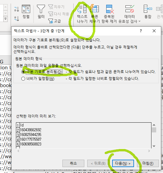 1.데이터 - 텍스트 나누기 를 선택함.