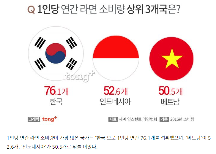 1인당 연간 라면 소비량이 가장 많은 국가는 '한국'으로 1인당 연간 76.1개를 섭취했으며, '베트남'이 52.6개, '인도네시아'가 50.5개로 뒤를 이었다.