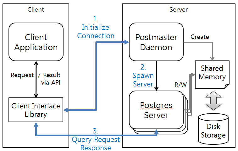 클라이언트는 인터페이스 라이브러리(libpg, JDBC, ODBC 등의 다양한 인터페이스)를 통해 서버와의 연결을 요청(1)하면, Postmaster 프로세스가 서버와의 연결을 중계(2)한다. 이후 클라이언트는 할당된 서버와의 연결을 통해 질의를 수행(3)한다(그림 5).