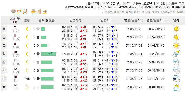 이번주 죽변항 물때표 - 2021.01.07 기준 www.badatime.com/