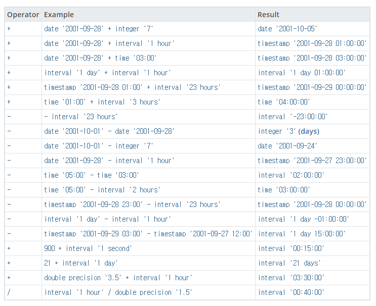 Table 9-27 shows the available functions for date/time value processing, with details appearing in the following subsections. Table 9-26 illustrates the behaviors of the basic arithmetic operators (+, *, etc.). For formatting functions, refer to Section 9.