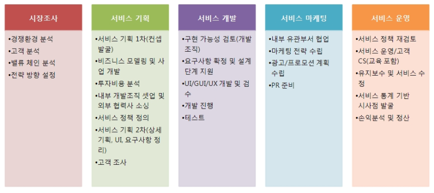 위 도표에서 보듯이 서비스 기획자는 크게 시장조사, 서비스 기획, 서비스 개발, 서비스 마케팅, 서비스 운영의 단계에 참여하게 됩니다. 많은 개발자들은 서비스 개발 단계의 서비스 기획 1차 이후의 단계에서 기획자들과 협업하지만 기획자들은 하나의 서비스를 만들기 위해 시장조사부터 전략 수립, 회사 내 의사결정 수렴 및 서비스 개발 이후의 단계까지도 많은 영역에서 다양한 부서의 담당자들과 함께 협업을 하고 있습니다. 물론 회사 규모가 작은 경우라면 한 두 사람이 모든 영역을 담당할 수도 있고, 또는 생략하는 경우도 있습니다만 해당 서비스가 커지고, 참여하는 사람이 많아지면 분명 각각의 단계가 서로 다른 사람들에 의해 진행되는 모습을 볼 수 있습니다.