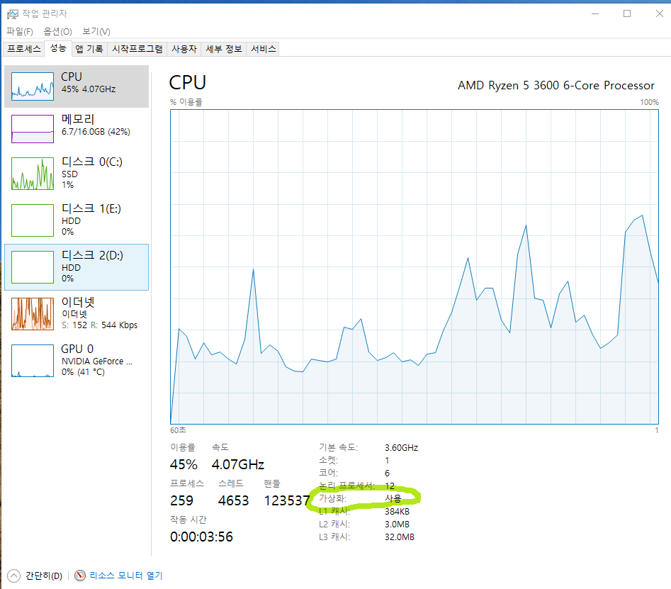 작업관리자 열어보면 가상화가 활성화된 모습을 볼 수 있다.