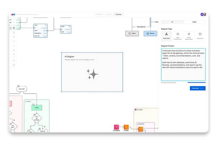 Simply type out your ideas in natural language, and the app generates a beautiful, colorful, icon-studded diagram in seconds. You can easily tweak it to perfection and quickly generate an outline for your design doc. Choose from four different diagram types and even include images in your prompts if you’d like, with full control over editing.