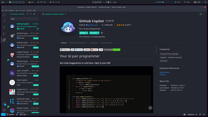 GitHub Copilot provides autocomplete-style suggestions from an AI pair programmer as you code. You can receive suggestions from GitHub Copilot either by starting to write the code you want to use, or by writing a natural language comment describing what you want the code to do.
