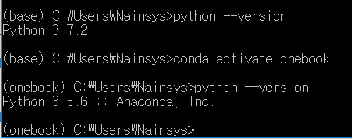 Anaconda Prompt에서 (koreait )이 표시되어 있다면 deactivate 를 입력하여 (base)환경으로 돌아옵니다. (base) 환경에서 python --version 을 실행해 봅니다. 그리고 “conda activate koreait ” 명령으로 가상환경 (koreait )을 활성화시킨 후 python --version 을 실행해 봅니다. (base) 환경에서 파이썬 버전은 3.7.2 이고 (koreait ) 환경에서 파이썬 버전은 3.5.6 이 적용됨을 확인할 수 있습니다.