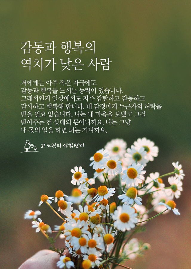 * 저에게는 아주 작은 자극에도 감동과 행복을 느끼는 능력이 있습니다. 그래서인지 일상에서도 자주 감탄하고 감동하고 감사하고 행복해합니다. 내 감정마저 누군가의 허락을 받을 필요 없습니다. 나는 내 마음을 보냈고 그걸 받아주는 건 상대의 몫이니까요. 나는 그냥 내 몫의 일을 하면 되는 거니까요.
