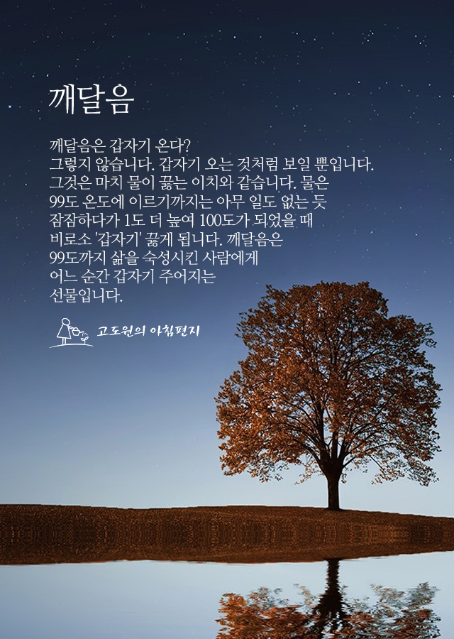 * 깨달음은 갑자기 온다? 그렇지 않습니다. 갑자기 오는 것처럼 보일 뿐입니다. 그것은 마치 물이 끓는 이치와 같습니다. 물은 99도 온도에 이르기까지는 아무 일도 없는 듯 잠잠하다가 1도 더 높여 100도가 되었을 때 비로소 '갑자기' 끓게 됩니다. 깨달음은 99도까지 삶을 숙성시킨 사람에게 어느 순간 갑자기 주어지는 선물입니다.