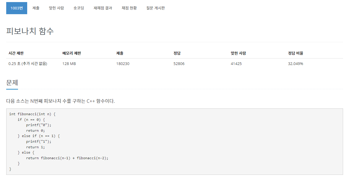 다음 소스는 N번째 피보나치 수를 구하는 C++ 함수이다.