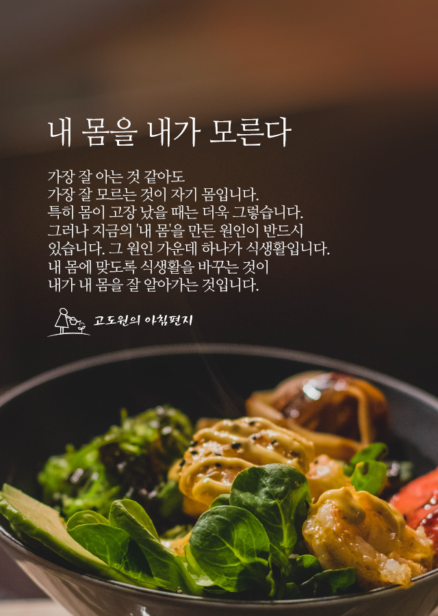 * 가장 잘 아는 것 같아도 가장 잘 모르는 것이 자기 몸입니다. 특히 몸이 고장 났을 때는 더욱 그렇습니다. 그러나 지금의 '내 몸'을 만든 원인이 반드시 있습니다. 그 원인 가운데 하나가 식생활입니다. 내 몸에 맞도록 식생활을 바꾸는 것이 내가 내 몸을 잘 알아가는 것입니다.