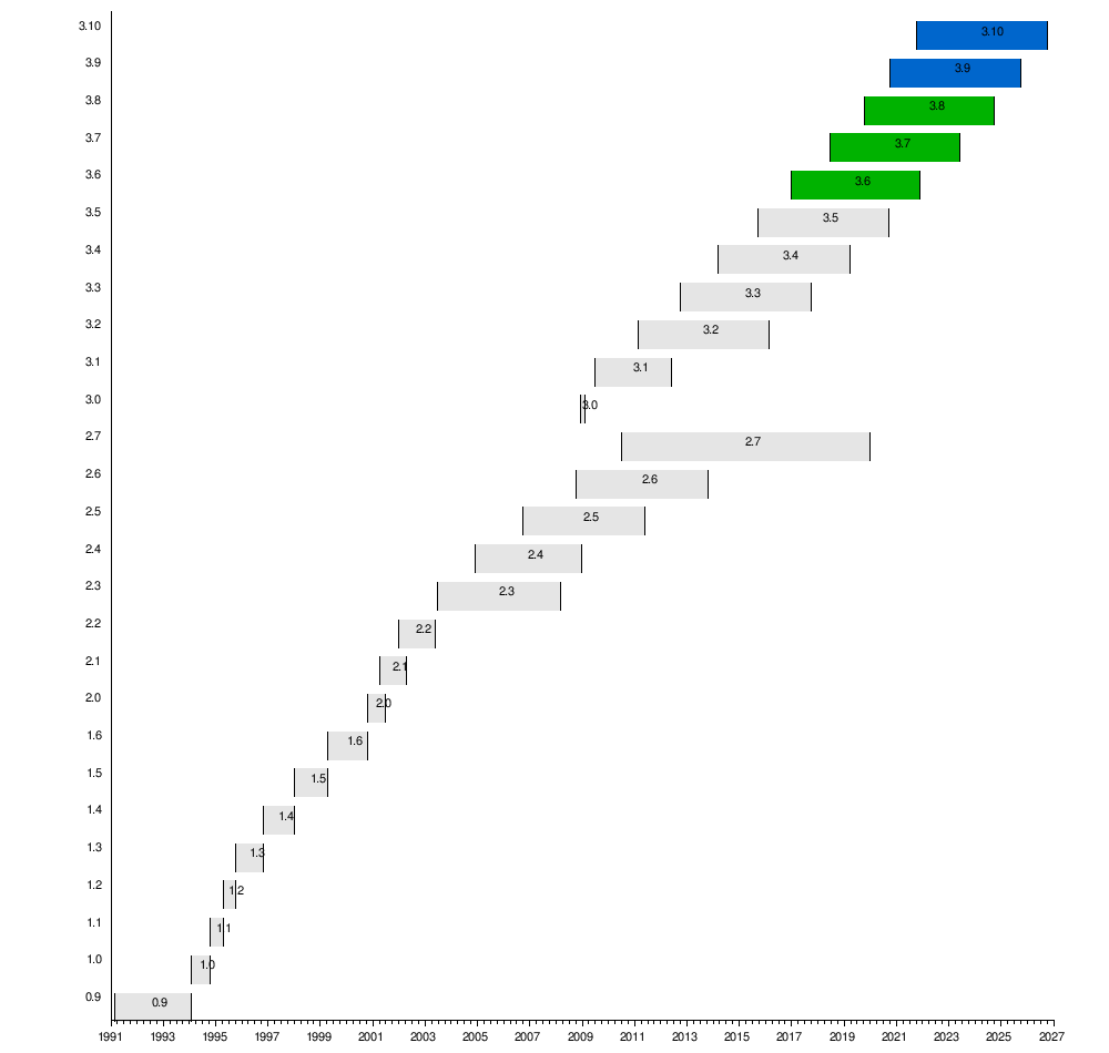이러한 테스트를 실행할 때 절대값은 프로세서(CPU 과중)에 따라 시스템마다 다릅니다.다음은 마지막 7개의 주요 Python 버전에 대한 결과입니다.