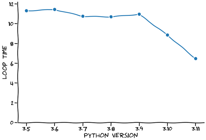 결과는 정말 놀랍습니다!이 속도를 유지하면 Python 3.14가 C++보다 빠를 것입니다.정확히는 루프 시간이-0.232초가 되므로 계산을 하기 직전에 완료됩니다.시공간 연속체에 구멍이 있는 것처럼 보이지만 이러한 계산은 확고합니다.그러므로 우리는 아인슈타인과 친구들의 작업에 의문을 제기해야 할 수도 있다고 생각합니다.
