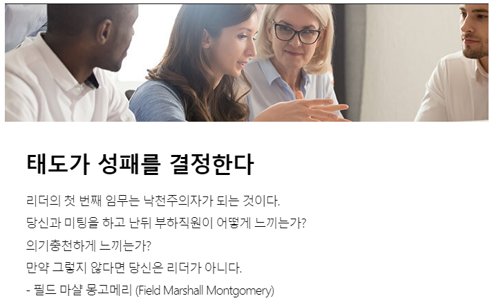 언제나 사물의 밝은 면을 보는 낙관적이며 명랑한 사업가는 비관적인 가업가보다 대체로 성공률이 높다고 합니다. (프레드릭 스미스, 페덱스 회장) 사실 그 자체보다 그에 대한 태도가 훨씬 더 중요합니다. 태도가 곧 성공과 실패를 결정하기 때문입니다. 특히 리더의 태도는 조직 전체로 전염되기 때문에 긍정적, 적극적 사고는 모든 리더의 필수조건입니다.