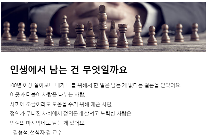 100년 이상 살아보니 내가 나를 위해서 한 일은 남는 게 없다는 결론을 얻었어요. 이웃과 더불어 사랑을 나누는 사람, 사회에 조금이라도 도움을 주기 위해 애쓴 사람, 정의가 무너진 사회에서 정의롭게 살려고 노력한 사람은 인생의 마지막에도 남는 게 있어요. - 김형석, 철학자 겸 교수