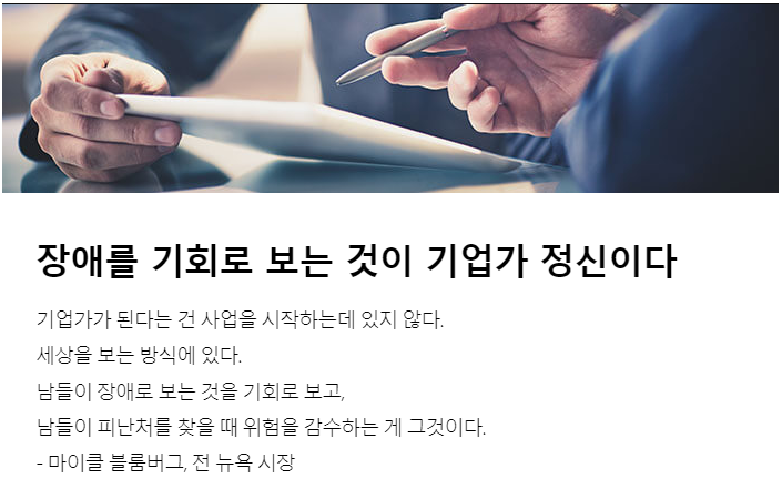 기업가가 된다는 건 사업을 시작하는데 있지 않다. 세상을 보는 방식에 있다. 남들이 장애로 보는 것을 기회로 보고, 남들이 피난처를 찾을 때 위험을 감수하는 게 그것이다. - 마이클 블룸버그, 전 뉴욕 시장