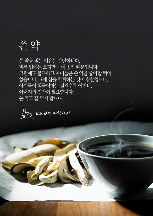 * 쓴 약을 먹는 이유는 간단합니다. 비록 입에는 쓰지만 몸에 좋기 때문입니다. 그럼에도 불구하고 아이들은 쓴 약을 좋아할 턱이 없습니다. 그때 힘을 발휘하는 것이 칭찬입니다. 아이들이 힘들어하는 것일수록 어머니, 아버지의 칭찬이 필요합니다. 쓴 약도 잘 먹게 합니다.