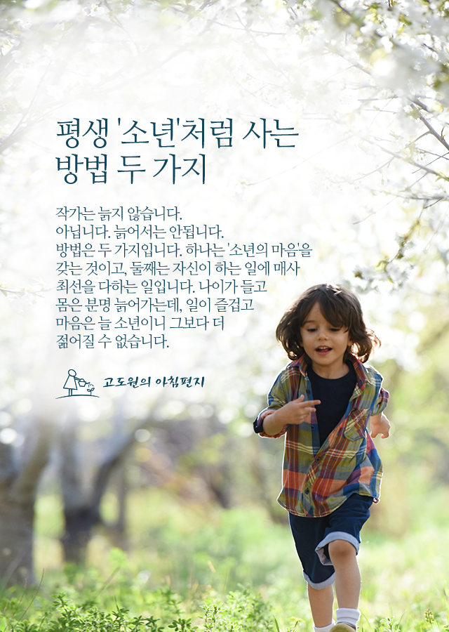 * 작가는 늙지 않습니다. 아닙니다. 늙어서는 안됩니다. 방법은 두 가지입니다. 하나는 '소년의 마음'을 갖는 것이고, 둘째는 자신이 하는 일에 매사 최선을 다하는 일입니다. 나이가 들고 몸은 분명 늙어가는데, 일이 즐겁고 마음은 늘 소년이니 그보다 더 젊어질 수 없습니다.