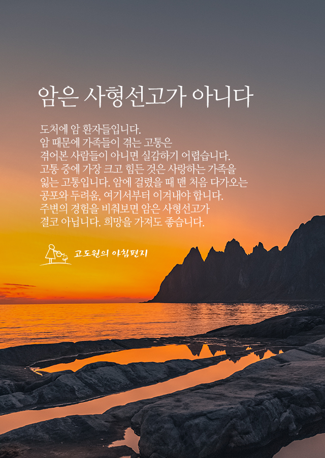 * 도처에 암 환자들입니다. 암 때문에 가족들이 겪는 고통은 겪어본 사람들이 아니면 실감하기 어렵습니다. 고통 중에 가장 크고 힘든 것은 사랑하는 가족을 잃는 고통입니다. 암에 걸렸을 때 맨 처음 다가오는 공포와 두려움, 여기서부터 이겨내야 합니다. 주변의 경험을 비춰보면 암은 사형선고가 결코 아닙니다. 희망을 가져도 좋습니다.