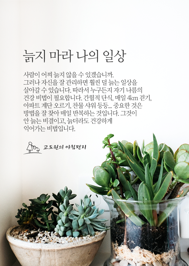 * 사람이 어찌 늙지 않을 수 있겠습니까. 그러나 자신을 잘 관리하면 훨씬 덜 늙는 일상을 살아갈 수 있습니다. 따라서 누구든지 자기 나름의 건강 비법이 필요합니다. 간헐적 단식, 매일 4km 걷기, 아파트 계단 오르기, 찬물 샤워 등등... 중요한 것은 방법을 잘 찾아 매일 반복하는 것입니다. 그것이 안 늙는 비결이고, 늙더라도 건강하게 익어가는 비법입니다.