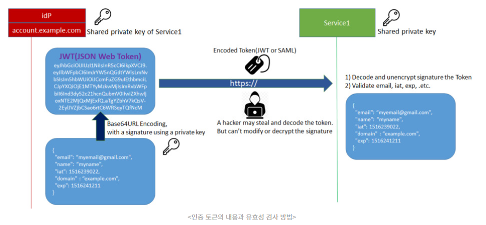 ① 인증 서버(idP)와 각 Service 서버들은 사전에 비밀키(private key)를 공유한다.