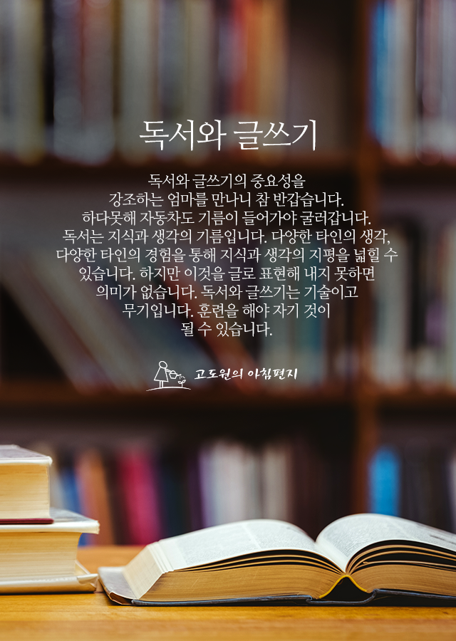 * 독서와 글쓰기의 중요성을 강조하는 엄마를 만나니 참 반갑습니다. 하다못해 자동차도 기름이 들어가야 굴러갑니다. 독서는 지식과 생각의 기름입니다. 다양한 타인의 생각, 다양한 타인의 경험을 통해 지식과 생각의 지평을 넓힐 수 있습니다. 하지만 이것을 글로 표현해 내지 못하면 의미가 없습니다. 독서와 글쓰기는 기술이고 무기입니다. 훈련을 해야 자기 것이 될 수 있습니다.