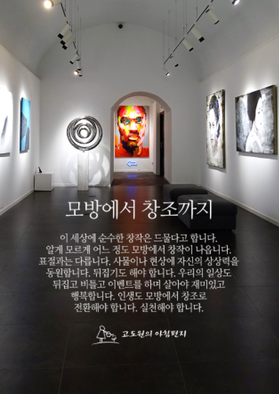 * 이 세상에 순수한 창작은 드물다고 합니다. 알게 모르게 어느 정도 모방에서 창작이 나옵니다. 표절과는 다릅니다. 사물이나 현상에 자신의 상상력을 동원합니다. 뒤집기도 해야 합니다. 우리의 일상도 뒤집고 비틀고 이벤트를 하며 살아야 재미있고 행복합니다. 인생도 모방에서 창조로 전환해야 합니다. 실천해야 합니다.