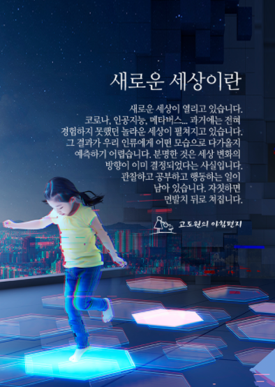 * 새로운 세상이 열리고 있습니다. 코로나, 인공지능, 메타버스... 과거에는 전혀 경험하지 못했던 놀라운 세상이 펼쳐지고 있습니다. 그 결과가 우리 인류에게 어떤 모습으로 다가올지 예측하기 어렵습니다. 분명한 것은 세상 변화의 방향이 이미 결정되었다는 사실입니다. 관찰하고 공부하고 행동하는 일이 남아 있습니다. 자칫하면 먼발치 뒤로 쳐집니다.
