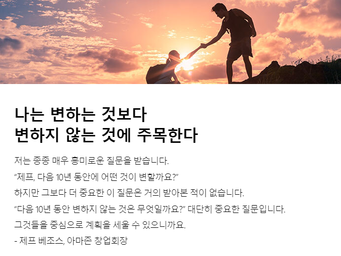 저는 종종 매우 흥미로운 질문을 받습니다. “제프, 다음 10년 동안에 어떤 것이 변할까요?” 하지만 그보다 더 중요한 이 질문은 거의 받아본 적이 없습니다. “다음 10년 동안 변하지 않는 것은 무엇일까요?” 대단히 중요한 질문입니다. 그것들을 중심으로 계획을 세울 수 있으니까요. - 제프 베조스, 아마존 창업회장